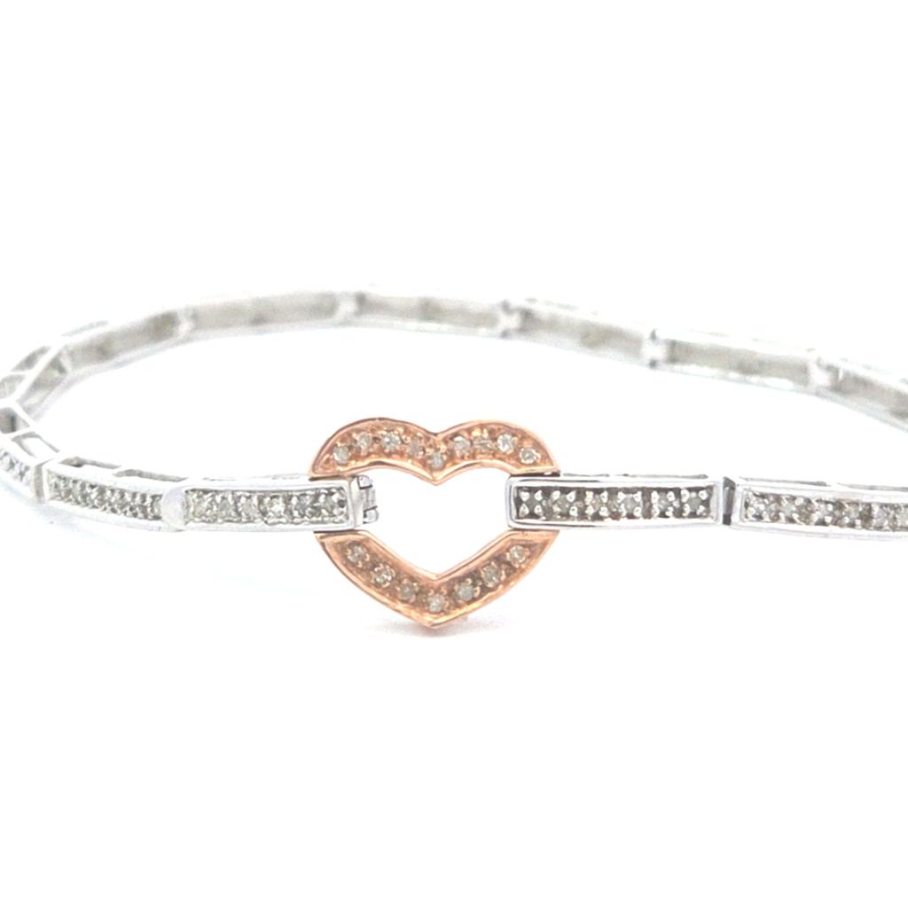The hallmark of this piece is balance—balance between warm and cool metal, between subtlety and sparkle, and between everyday wear and special-occasion polish. Likewise, the diamonds are thoughtfully set to provide continuous light return along the wrist. While the heart-shaped clasp draws the eye, it also serves as a distinctive, memorable detail that sets your bracelet apart from ordinary designs.