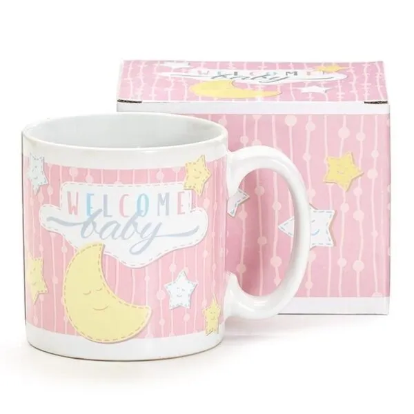 13oz Pink Ceramic Welcome Baby Mug with Moon & Stars