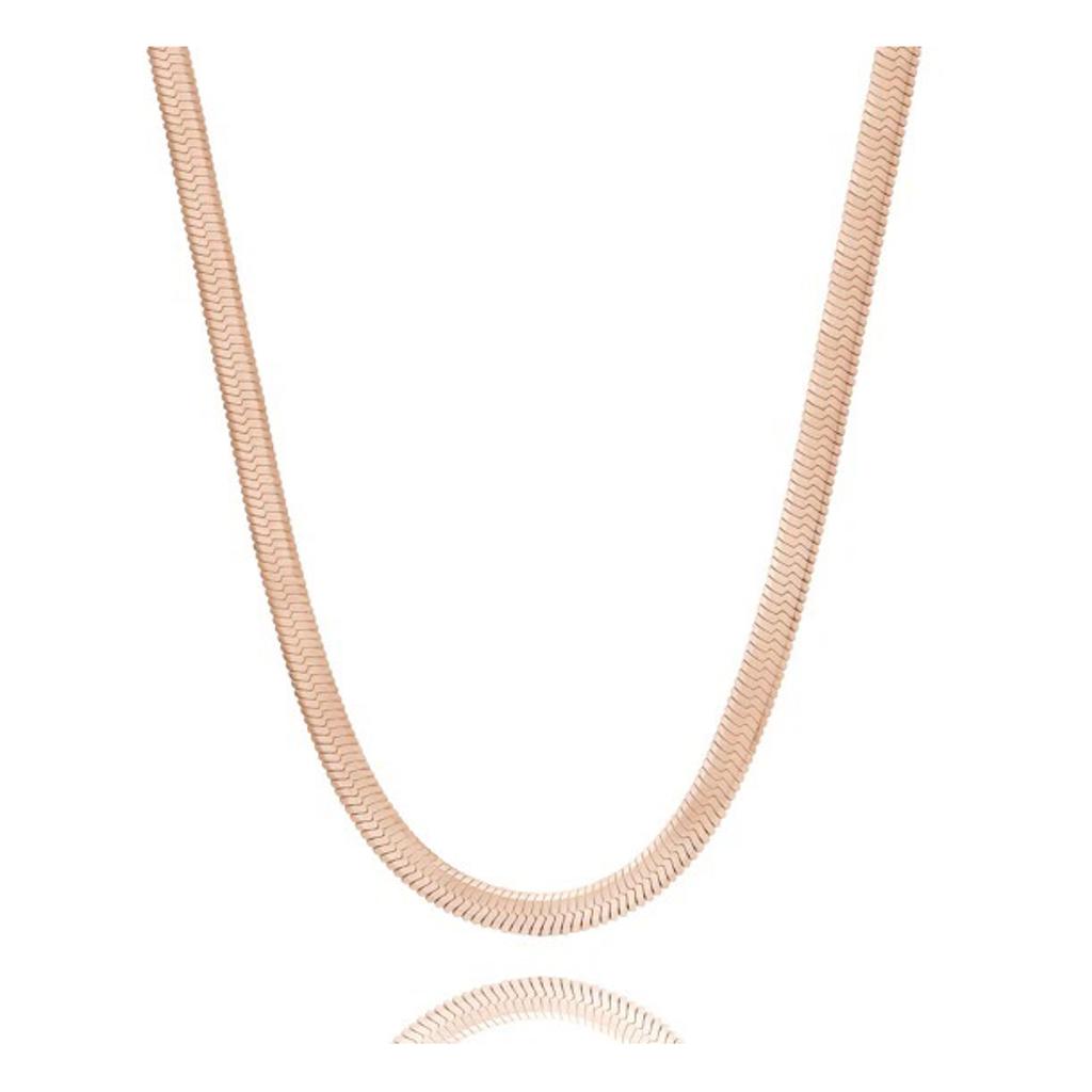 Because this 14k rose gold herringbone necklace lays flat, it catches light evenly across the surface for a sleek, mirror-like finish. In addition, the herringbone pattern hugs the neckline, which means it slips neatly under blazers and collars without bunching. On the other hand, it still reads as a statement piece thanks to the wide 5mm profile that frames your face and décolletage. As a result, you get a single necklace that can anchor your jewelry wardrobe—no complicated layering necessary.