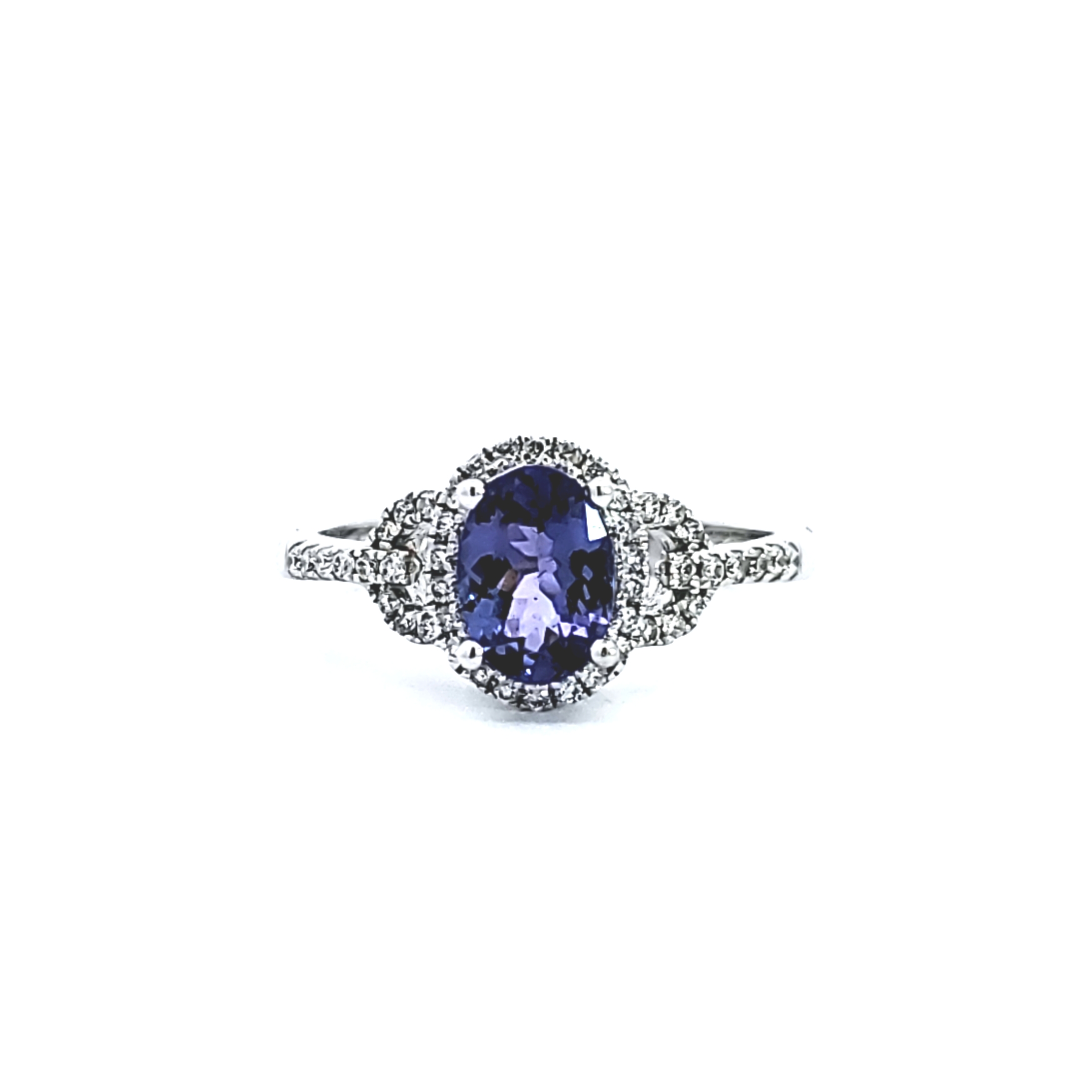 14K White Gold Halo Ring with Diamonds and Oval Tanzanite