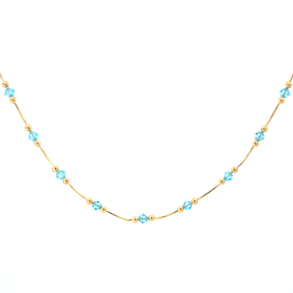 The beauty of a 14 karat yellow gold aquamarine station necklace