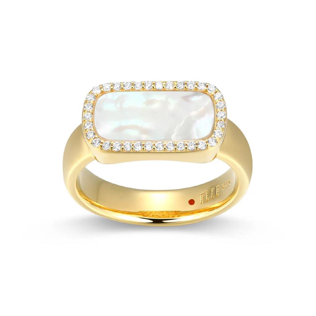 Step into the spotlight with a ring that encapsulates contemporary style. The Mother of Pearl statement ring showcases a luxurious Mother of Pearl centerpiece, beautifully encircled by a halo of sparkling cubic zirconia (CZ). Designed with meticulous attention to detail, this ring epitomizes modern jewelry trends while providing you the versatility for various occasions.