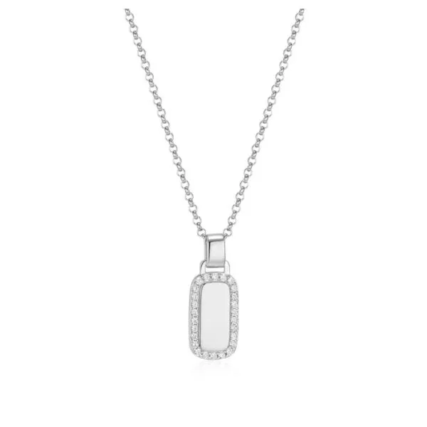 The necklace features a stunning rectangular drop pendant, adorned with brilliant Cubic Zirconia (CZ) that captures light beautifully. The white color of the CZ stones provides a timeless aesthetic, ensuring that this piece can be worn for any occasion. The pendant gracefully hangs from a 17-inch Rolo chain, complemented by a convenient 3-inch extender, allowing you to adjust the length to perfectly suit your neckline.