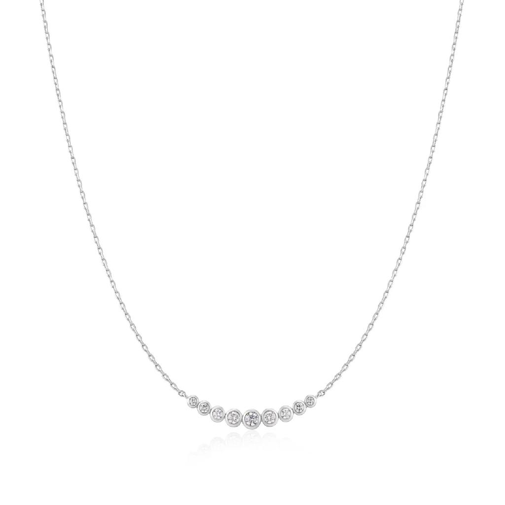 Minimalist by design yet striking in detail, this Ania Haie silver cubic zirconia bar necklace balances subtlety and shine. Moreover, the graduated CZ arrangement creates a refined shimmer that feels intentional and elegant. However, it’s the bezel settings that truly set it apart: they frame each stone with sleek metal for extra security and a smooth profile that glides against fabric and skin.