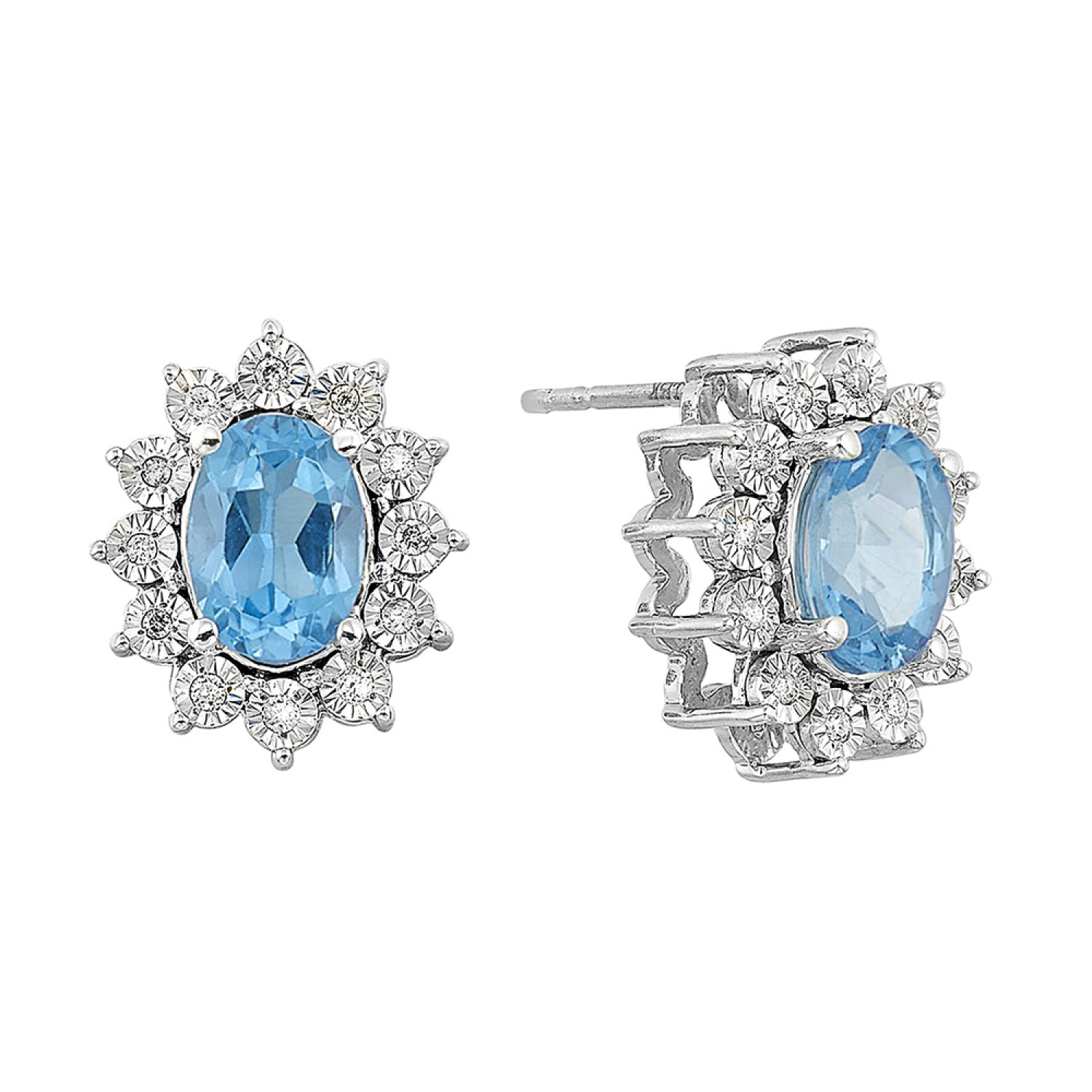 - Unique Setting: The halo design, featuring a striking blue topaz surrounded by dazzling .10ctw oval diamonds, creates an eye-catching sparkle that sets these earrings apart from ordinary stud designs.