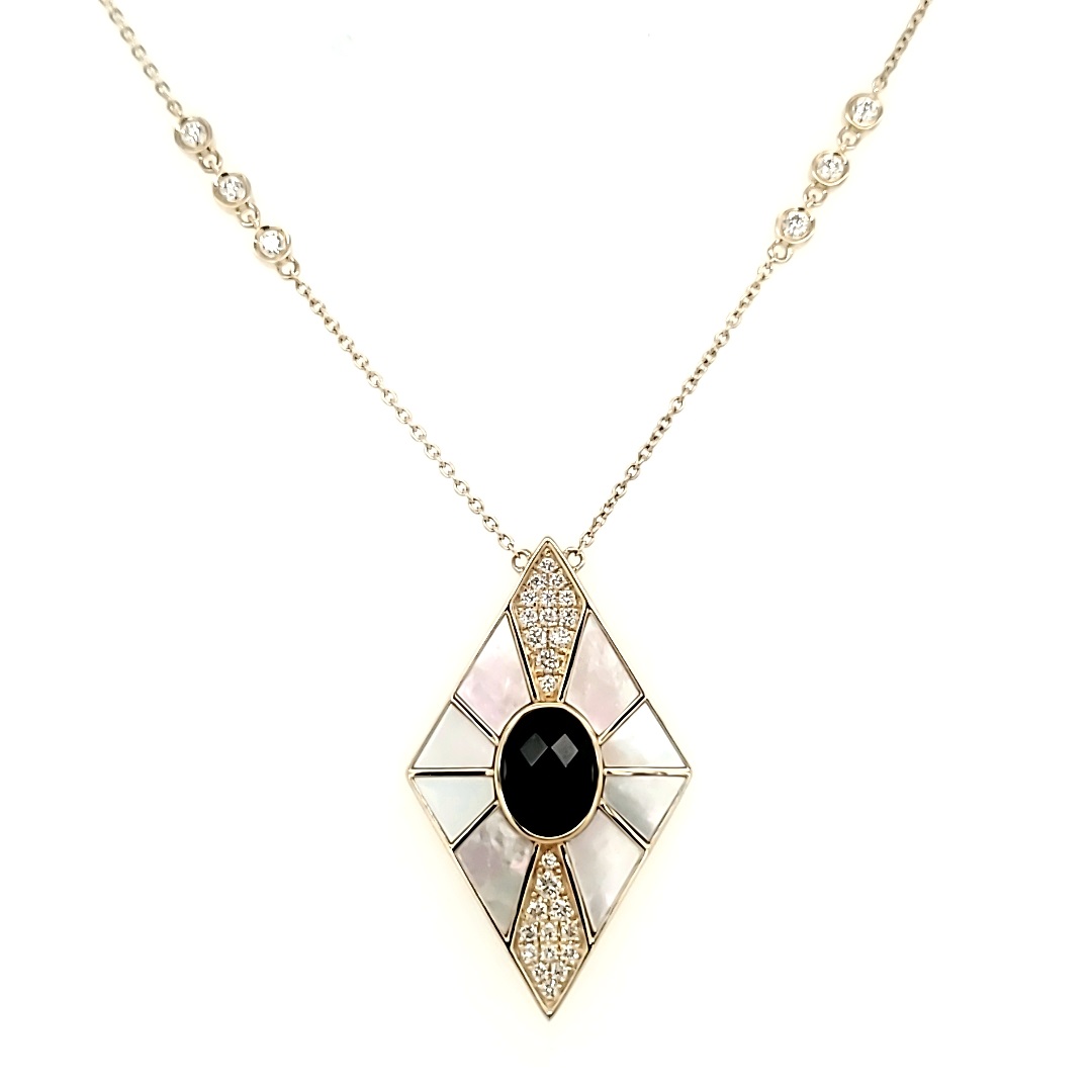 Crafted meticulously from 18k yellow gold, this necklace showcases a harmonious combination of onyx accents, rich mother-of-pearl inlays, and dazzling .43ctw round diamonds. The quality of materials used is not just a feature; it fulfills the need for durability without compromising on aesthetics. With its stylish design, this necklace allows you to express your unique fashion sense effortlessly.