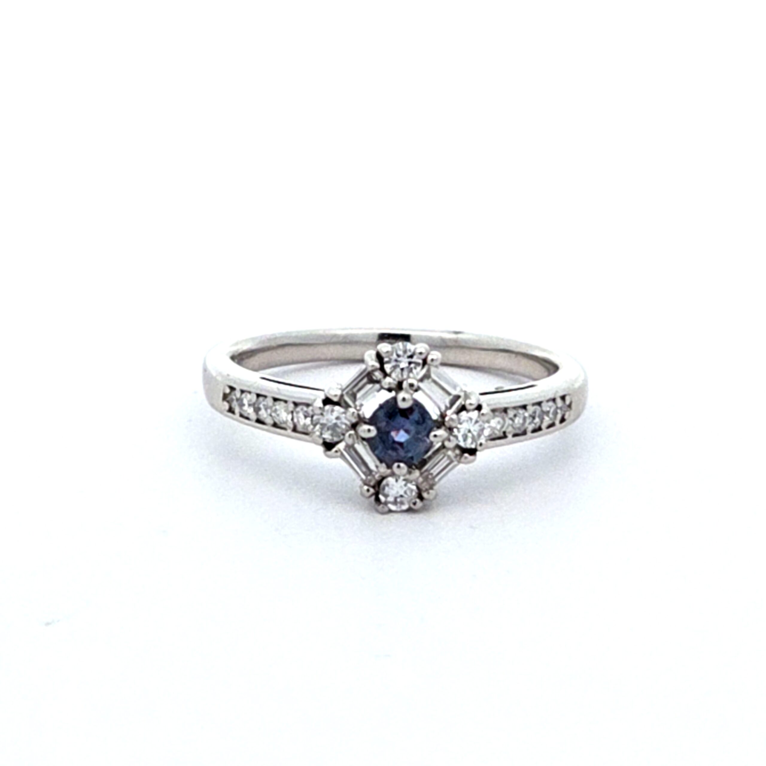 - Brilliant Diamonds: Featuring .28 carats of carefully selected round diamonds and baguette accents, this ring radiates brilliance. The diamonds are set strategically, enhancing their sparkle in any light.
