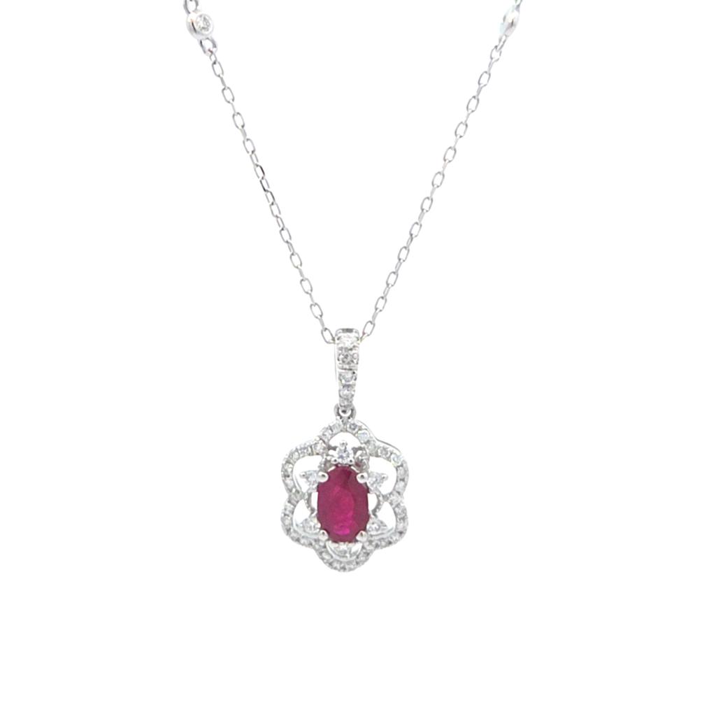 Floral Necklace featuring Oval Ruby and Diamonds in 14k White Gold