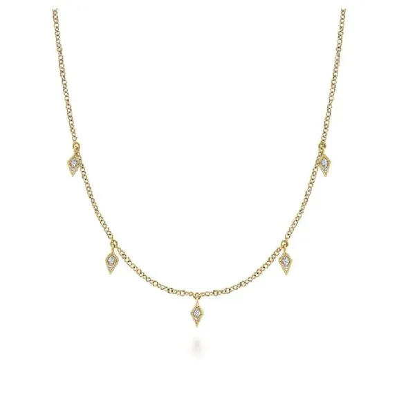 Radiating sophistication, the Gabriel & Co Kite Station Droplet Necklace features a stunning design crafted from 14k yellow gold, accentuated by delicate .05ctw diamonds. Whether you’re dressing up for an elegant evening or complementing your everyday attire, this necklace strikes the perfect balance between modern aesthetics and timeless charm.