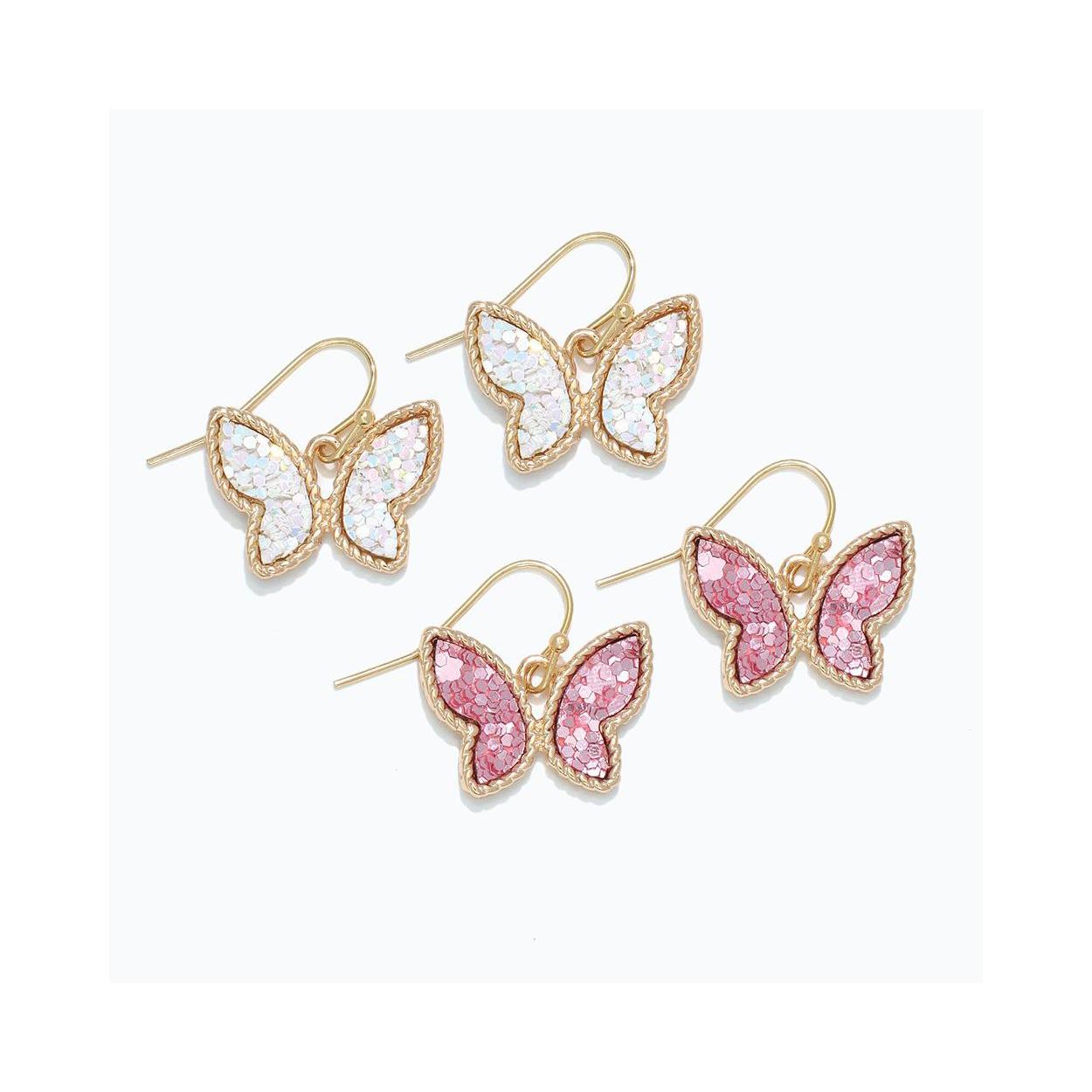 Gold, White & Pink Glitter Butterfly Dangle Earrings