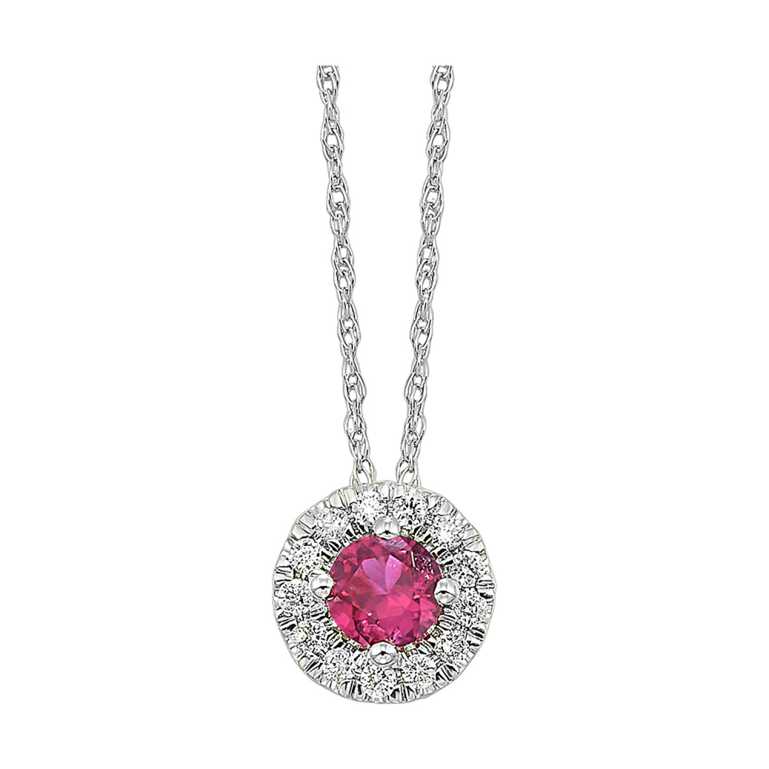 Halo Drop Necklace with .10ctw Round Diamonds and Pink Sapphire in 10k White Gold
