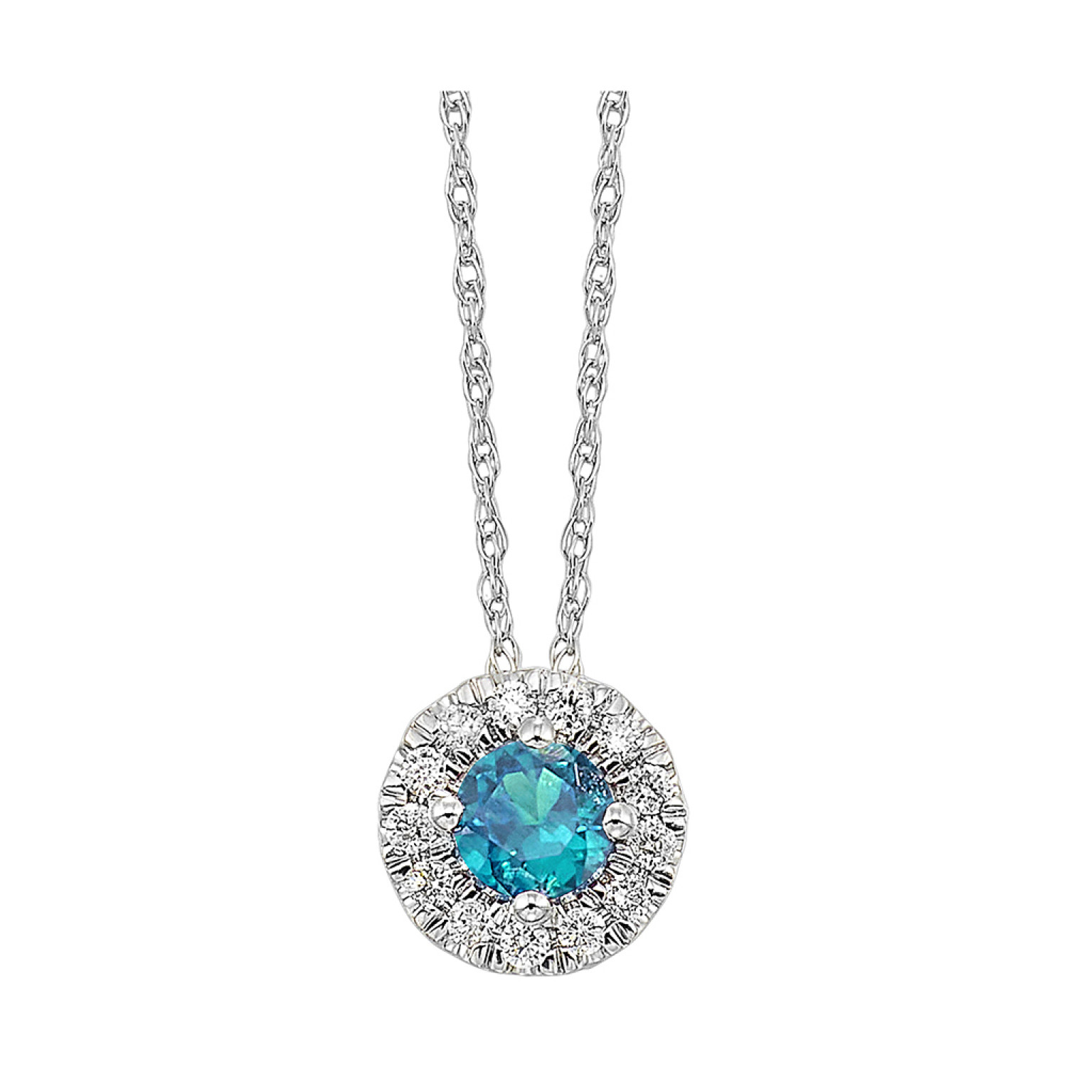 Be the first to review “Halo Drop Pendant with .10ctw Blue Topaz and Round Diamonds in 10k White Gold”