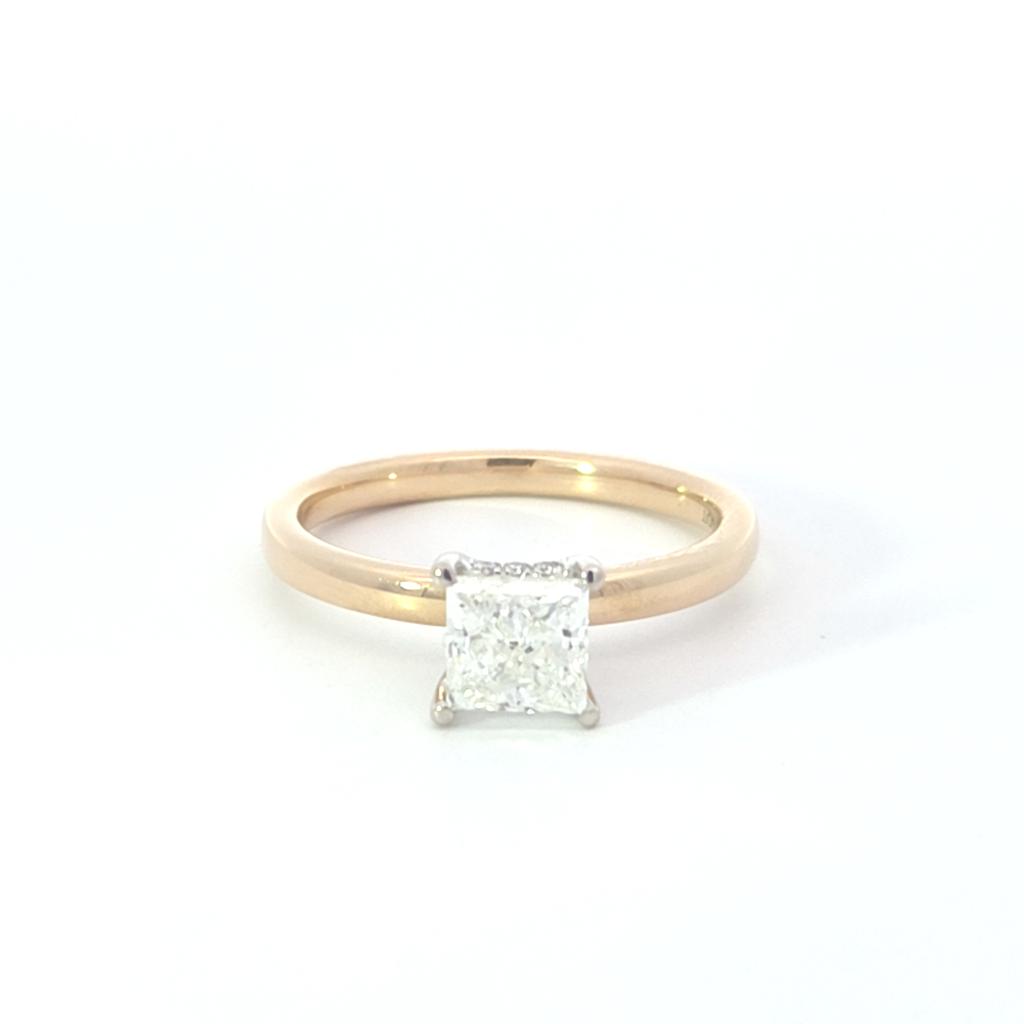 Whether you call it a peekaboo halo engagement ring, a concealed halo engagement ring, or a hidden diamond halo engagement ring, each term describes the radiant ring of sparkle positioned under the center setting. Nevertheless, our two-tone 14k design adds an elevated dimension: metal contrast that enhances the halo’s light play and helps your ring coordinate seamlessly with mixed-metal stacks.