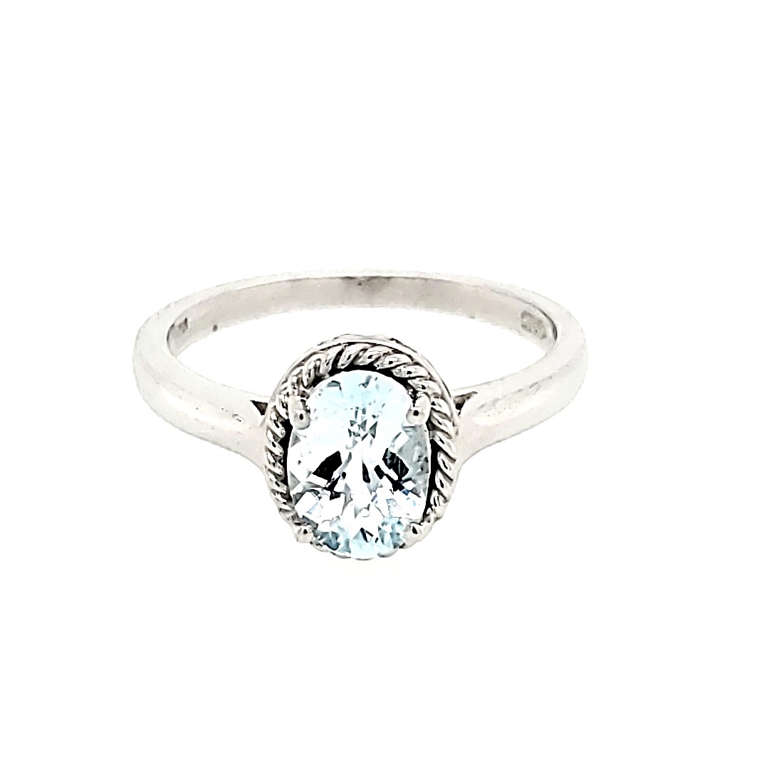 This oval lab-created aquamarine gemstone ring is simply sensational, set in sterling silver with a delicate rope edge.