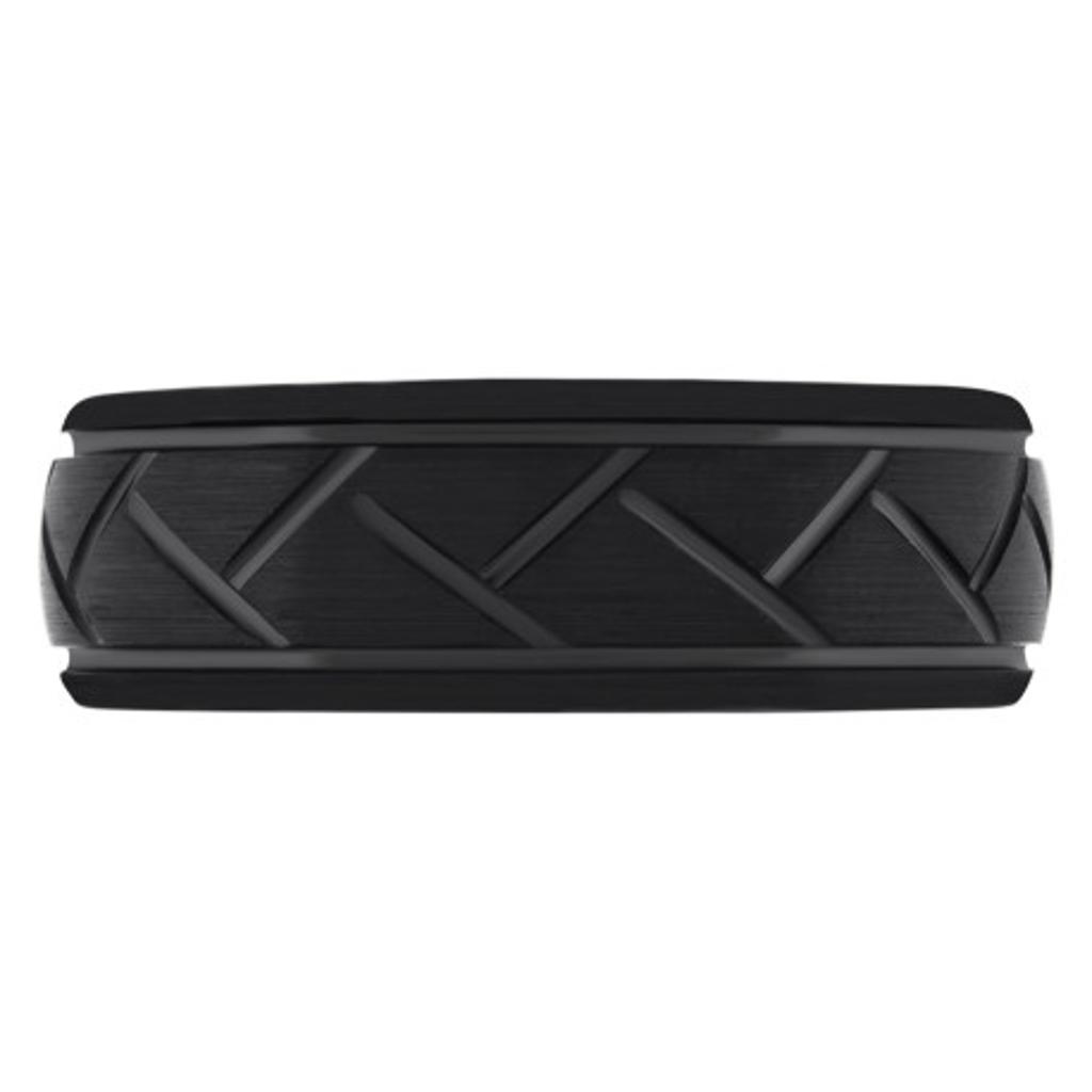 The repeating diagonal lines wrap the band in a dynamic, architectural motif. They catch the light just so—never flashy, always refined. Moreover, the black finish provides a sophisticated contrast that frames the texture and adds depth. The 8mm width strikes a balanced silhouette, offering presence without compromising comfort. Therefore, if you’re seeking a tungsten men’s wedding ring that looks distinctive but remains timeless, this design achieves that equilibrium.