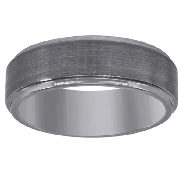 Featuring a brushed finish, this wedding band is crafted in tungsten carbide with step edges for a bold look. The fine jewelry ring is 7mm wide and is comfort fit for maximum comfort. Tungsten carbide is made from a patented formula and is prized for its strength and durability.