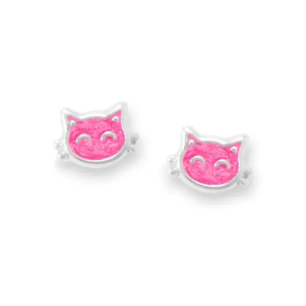 Pink Enamel Kitty Face Stud Earrings in Sterling Silver