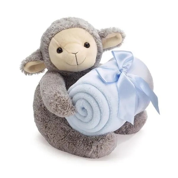 Soft plush baby lamb with blue blanket: the perfect gift-ready keepsake