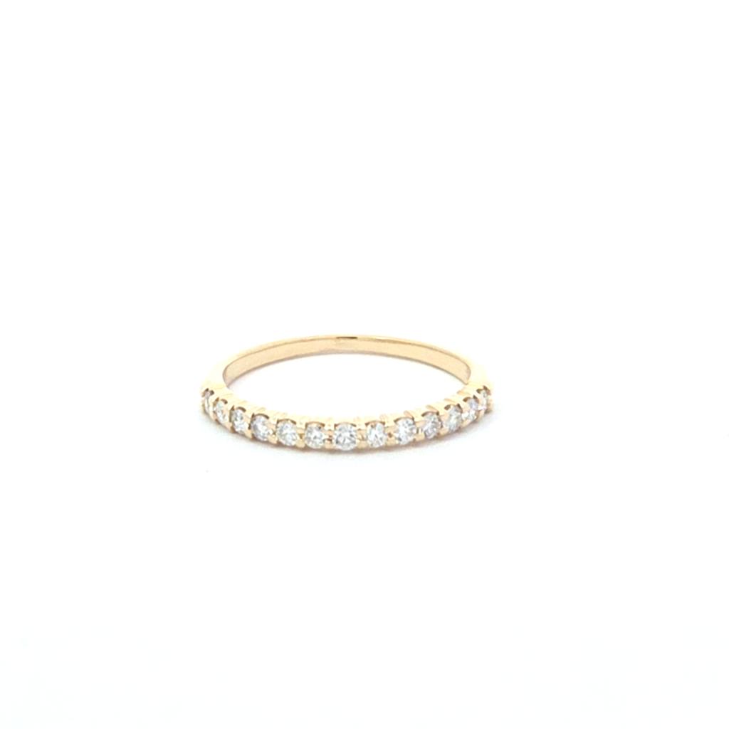 Though delicate in appearance, 14K yellow gold is designed for longevity, making it a thoughtful choice for a ring you’ll reach for daily. The diamond accents add soft, continuous sparkle without being overpowering. Moreover, the streamlined profile sits neatly alongside most engagement rings and other bands, ensuring a cohesive stack that still lets each piece shine.