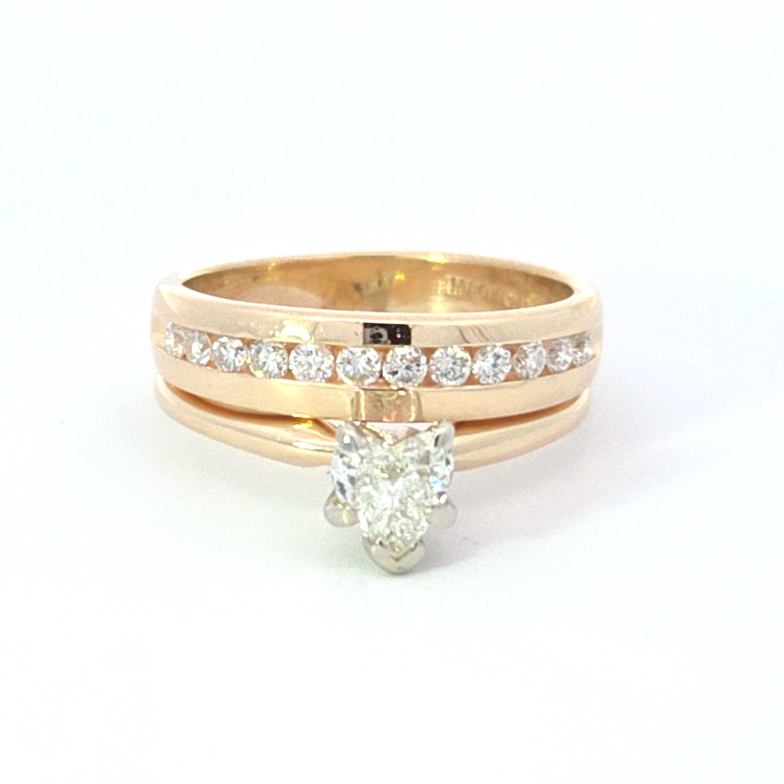 Our 14K Yellow Gold Heart-Shaped Diamond Engagement Ring with its accompanying channel set wedding band is more than just jewelry; it’s a tale waiting to be told. Each glance at this ring serves as a reminder of love, commitment, and shared dreams.