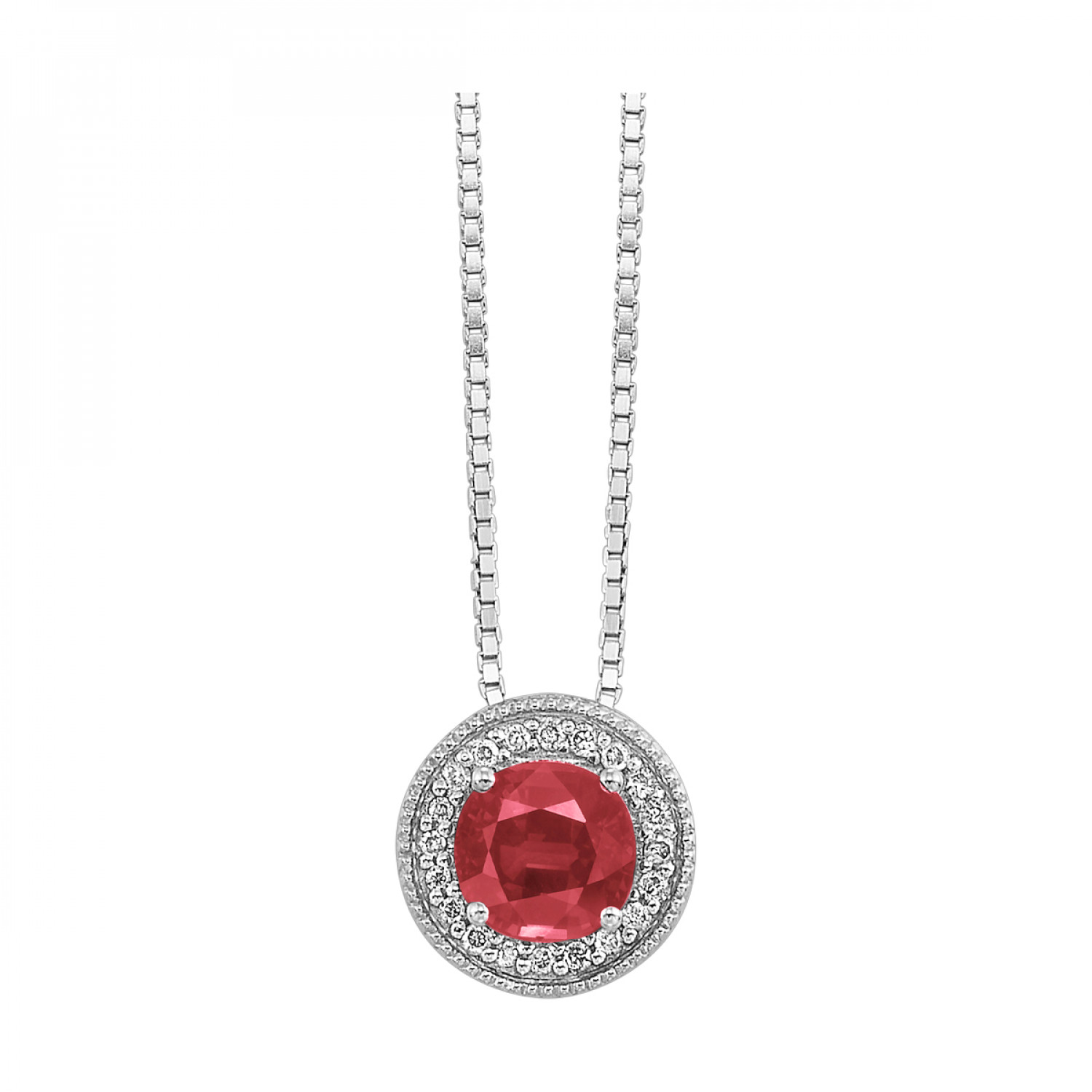 Be the first to review “Ruby Halo Drop Necklace with .05ctw Round Diamonds in Sterling Silver”