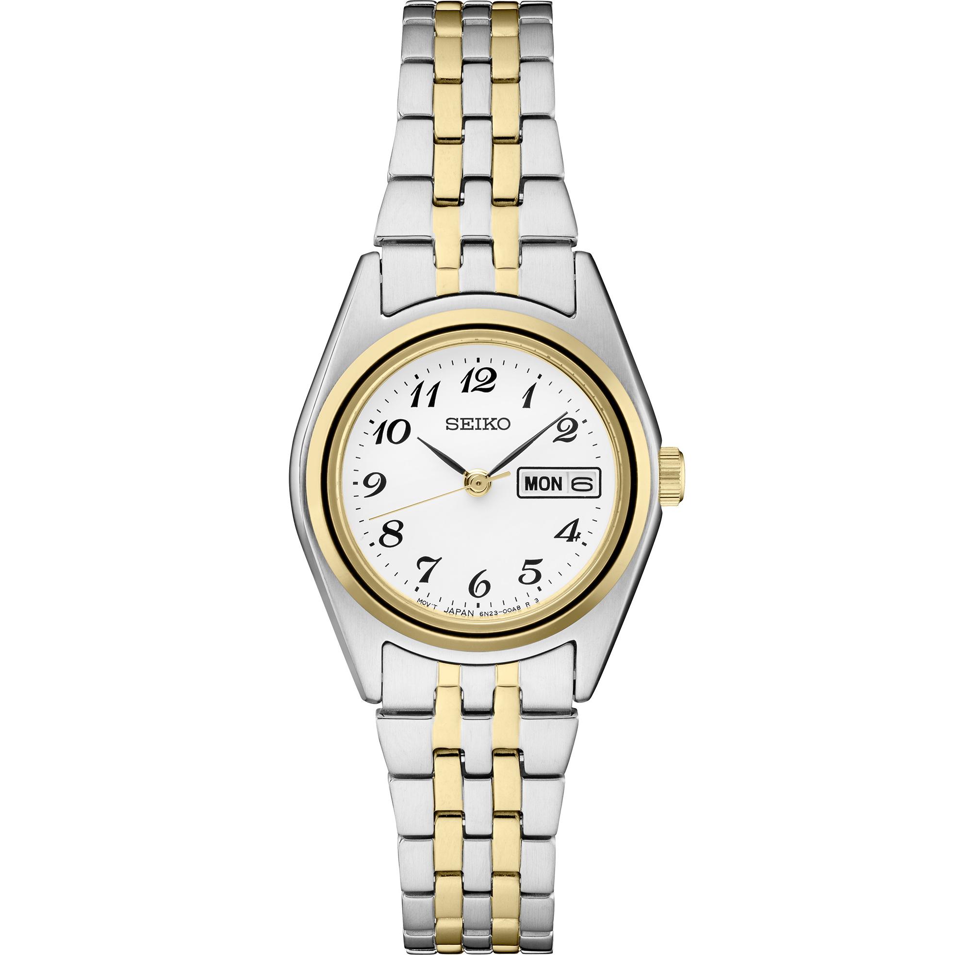 Seiko Stainless steel case with a two-tone (silver-tone and gold-tone) stainless steel bracelet. Fixed gold-tone bezel. White dial with black hands and Arabic numeral hour markers. Minute markers around the outer rim. Dial Type: Analog. Day of the week and date display at the 3 o’clock position. Quartz movement. Scratch resistant Hardlex crystal. Solid case back. Round case shape. Case size: 25.5 mm. Case thickness: 8.57 mm. Fold over clasp with a safety release. Water resistant at 100 meters / 330 feet. Functions: date, day, hour, minute, second.