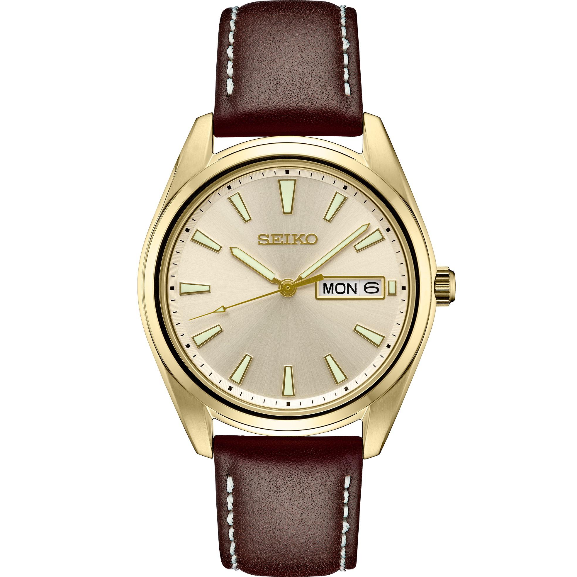 Seiko Yellow gold-tone stainless steel case with a brown leather strap. Fixed yellow gold-tone bezel. Champagne dial with yellow gold-tone hands and index hour markers. Minute markers around the outer rim.