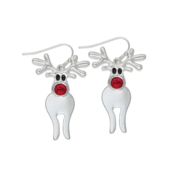 - Dangle-style reindeer motif inspired by Rudolph’s iconic red nose