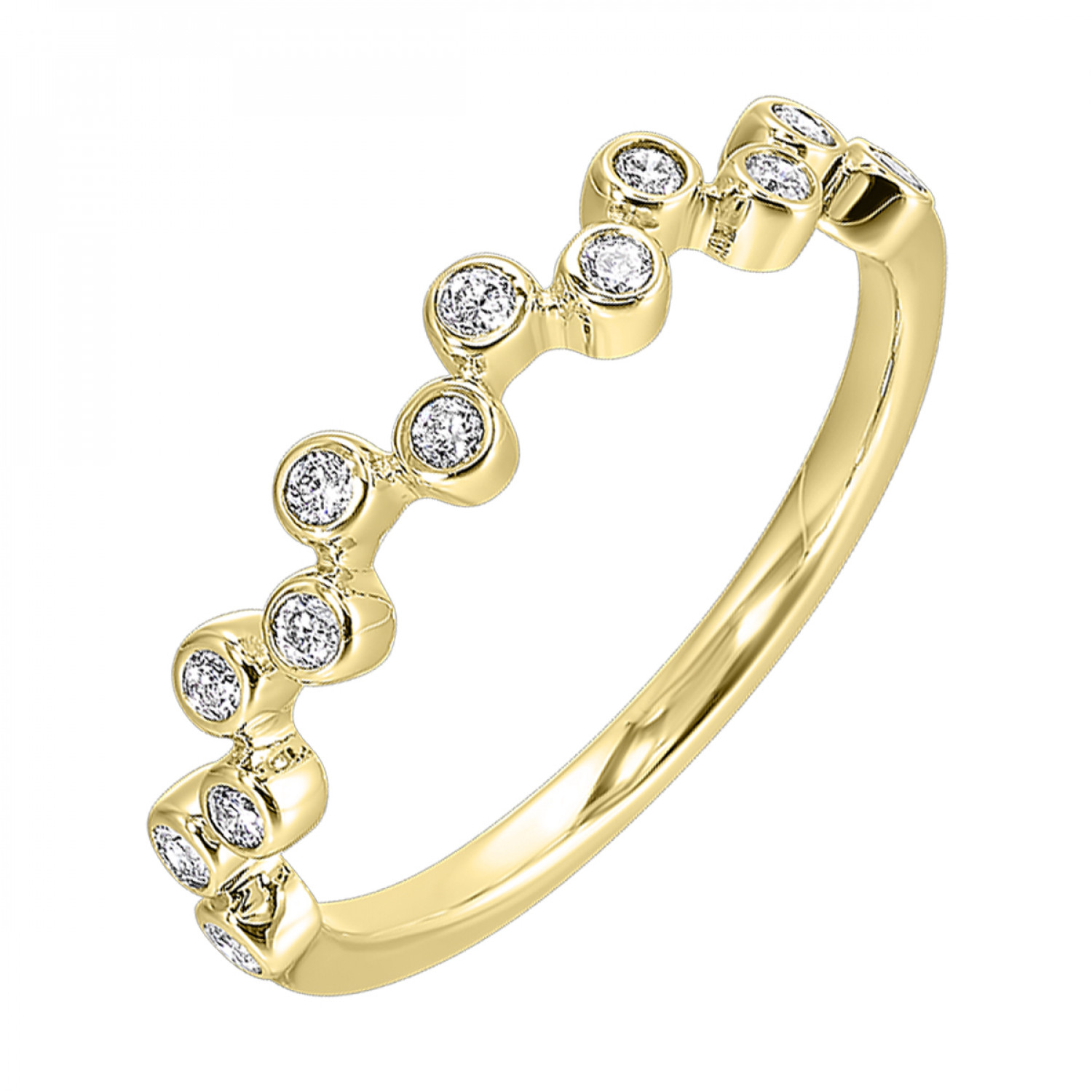 Offset bezels with round brilliant diamonds totaling .20ctw set in trendy 14 karat yellow gold make this stackable style ring a must-have for any jewelry collection.