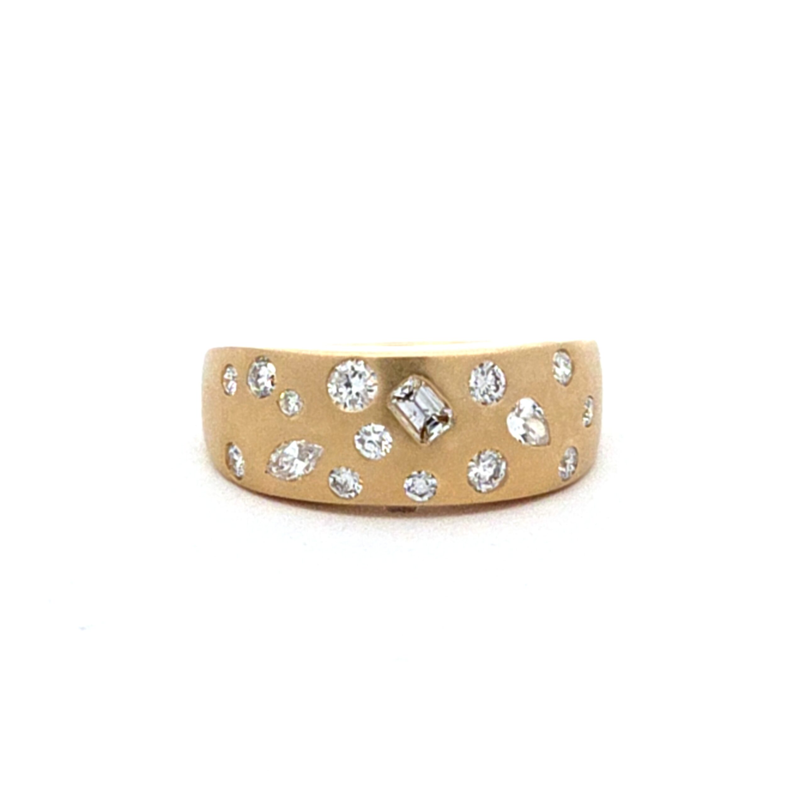 Welcome to Hoppe Jewelers, where elegance meets modern design. Introducing the 14K Yellow Gold Satin Confetti Ring with Diamonds, a piece that not only enhances your jewelry collection but also serves as a perfect reflection of your unique style. Whether you are commemorating a special occasion or searching for an exquisite engagement ring, this ring is the epitome of elegance and versatility.