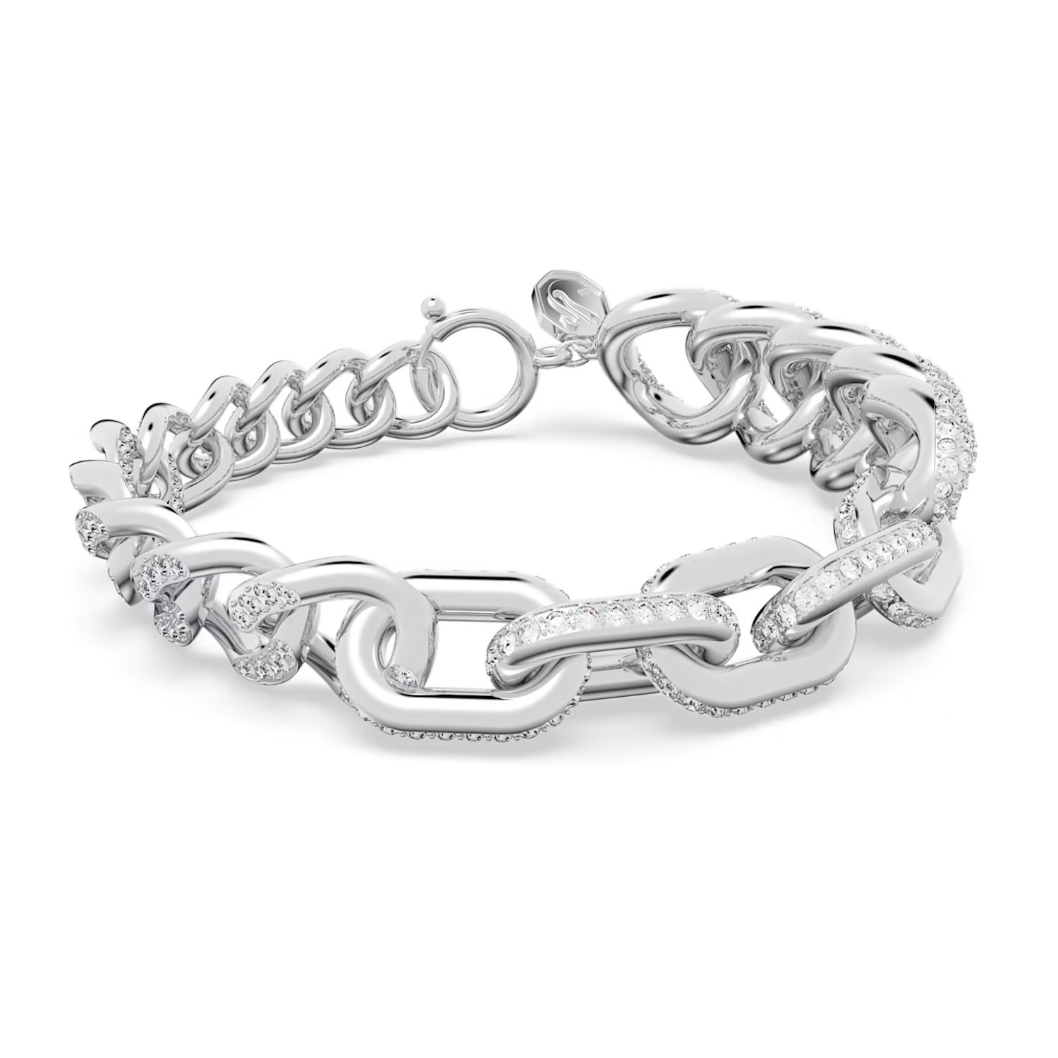 Designed to be genderless, this statement bracelet will elevate any look. Striking the perfect harmony of Swarovski’s iconic pavé technique with bold metal construction, this rhodium plated piece puts a contemporary spin on classic chain link designs. It has a refined spring closure and can be styled with anything, from office tailoring to formal eveningwear. This bracelet is part of the Dextera family, designed by Creative Director Giovanna Engelbert for Collection III.