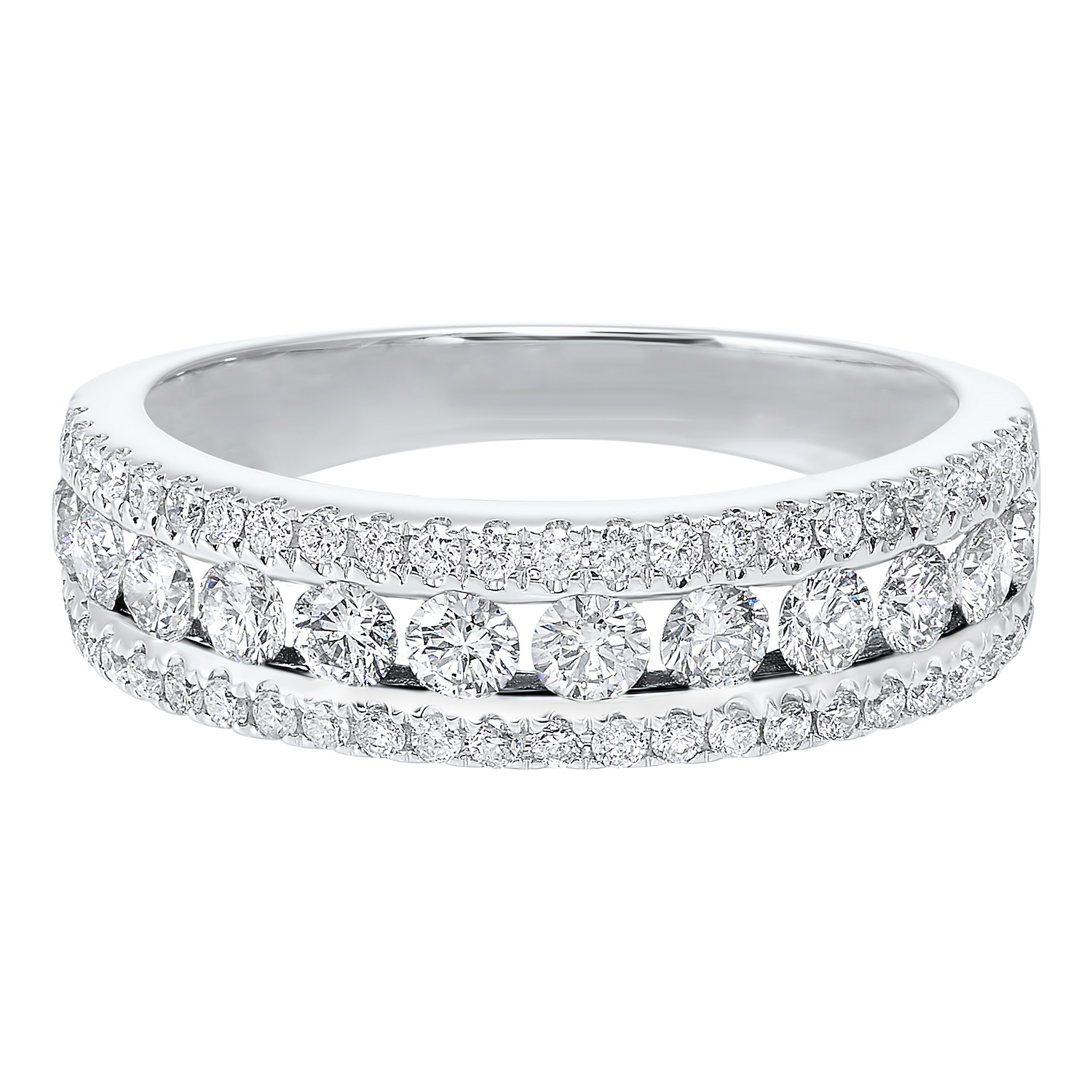 A stunning wedding or anniversary band for her featuring 3 rows of brilliant round diamonds for maximum sparkle, crafted from classic 14k white gold.